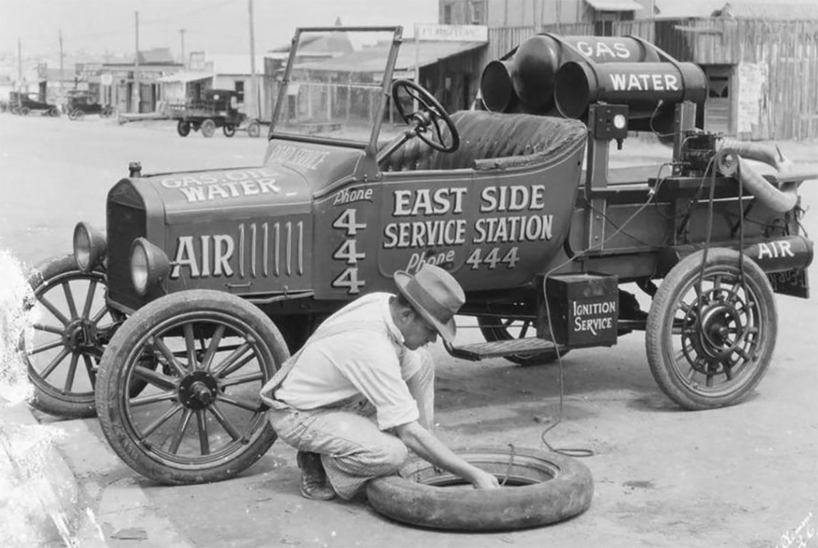 It's got some sort of pulley or sprocket on the left rear wheel to run the compressor. I'd guess it's a pulley for a link belt, which he may have slipped off and on as needed. That would require jacking up the wheel, unless he had some kind of "dog" or other arrangement to allow the axle and pulley to run independent of the wheel. I can't read what it says across the bottom of the picture, which may have been taken in Breckenridge, Texas. I know that some early businesses had similar phone numbers, and East Walker Street has a hill very much like what the picture shows, and there has been a gas station/garage near the top of it for as long as I can remember. Looking down the hill, there is something that could be a wooden oil derrick. All of that would be consistent with Breckenridge in the 1920s.