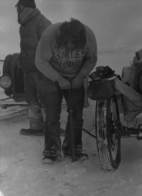 Low tire. I'm not sure what possessed us to race in the Winter. Pumping is difficult with coats etc. on. Likely 1972.