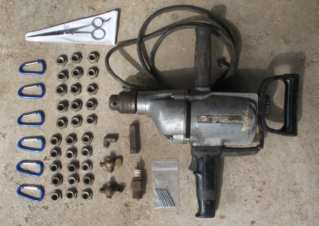 Scissors that aren't half plastic like all the ones in stores; half a dozen snap clips; thirty valve stem nuts; a working drill; #6154 carb elbow (brass); two petcocks; valve stem cover; circa 1922 Champion X plug; seven Dremel-size carbide cutters.