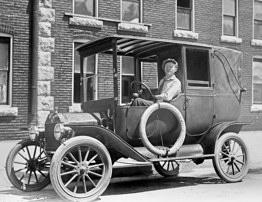 I "think" it is a 1914 runabout with a custom top built onto it. The car has so many little things, coupled with the fenders, that being sure about the year of it is difficult. I can't tell for certain whether the fenders are after-market or Ford factory 1917 and later fenders. Usually, the crown is different enough on the after-market fenders to tell them apart. But this photo was taken from a low enough angle I can't tell for sure. The rear fender does look like a 1917 Ford fender to me. If the fenders are 1917 or later Ford fenders, then the customization of this coupe would likely have been done in the late 1910s.