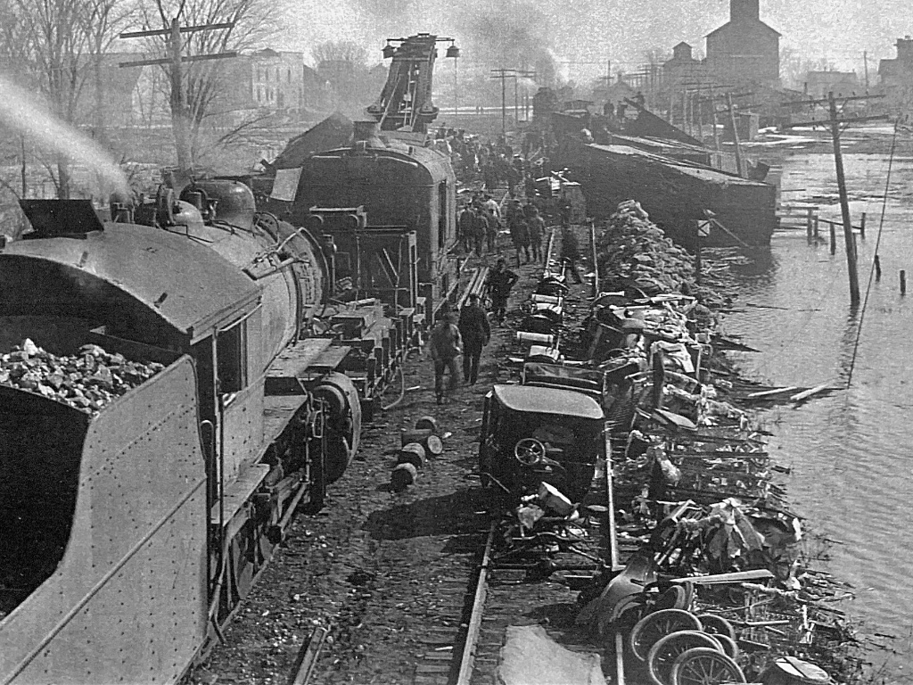 Picture 14 looks like there was a derailment as evidenced by the boxcars on their sides in the water next to the tracks. The boxcars were unloaded prior to righting them back onto the tracks with the crane. Apparently, the boxcars were loaded with new Model T’s and Model T parts which line the tracks. Jim Patrick