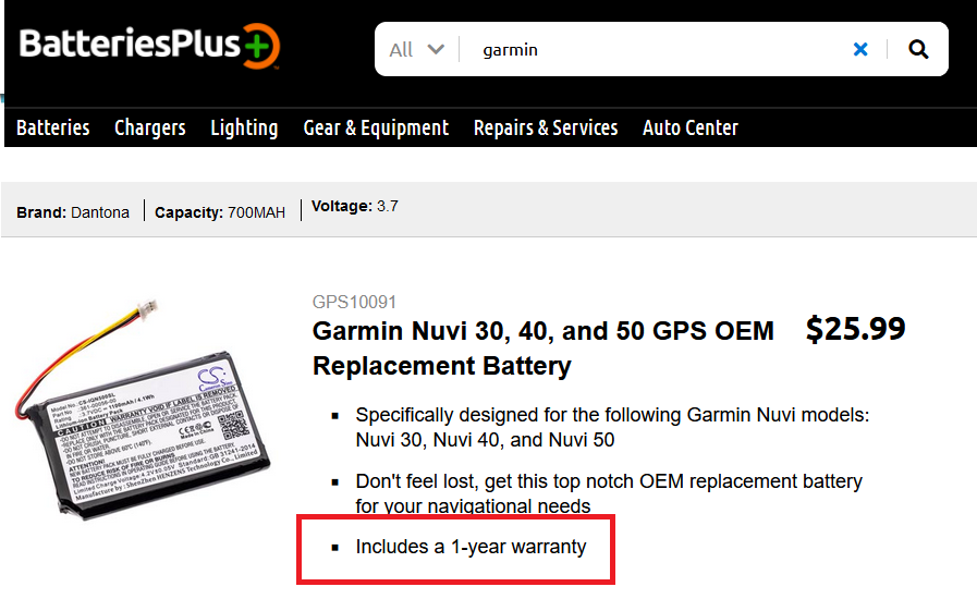 The battery is a Garmin 361-00056-00 there are many seller's but need to make sure the replacement is "new". I'd get one from BatteriesPlus, price is about the same and they may even replace it for you for free, & if it doesn't work for them then you know the GPS is dead