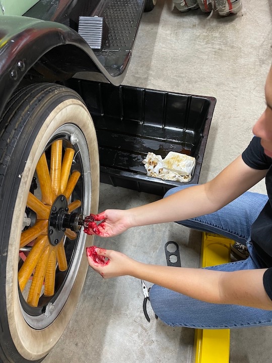 My '26 Runabout had shoes with pieces of rivets but no lining. I relined them with material from one of our vendors. I used a coarse 2"-wide wood rasp to take down the lining to where I was satisfied with fit. I also had to round over the lining edge on the outboard side to match the rounded corner of the wire wheel drum.