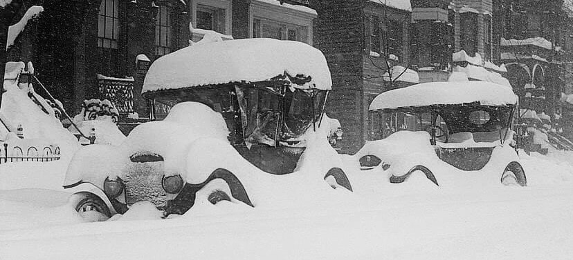 The first car is surely a Model T of 1917 or later. The second looks like a '15 or so Buick. The radiator emblem, windshield posts and oval rear window would fit that. Several others were similar. It looks like a nice neighborhood. I think it would take some shoveling to get the cars out in the street. Or some pushing.