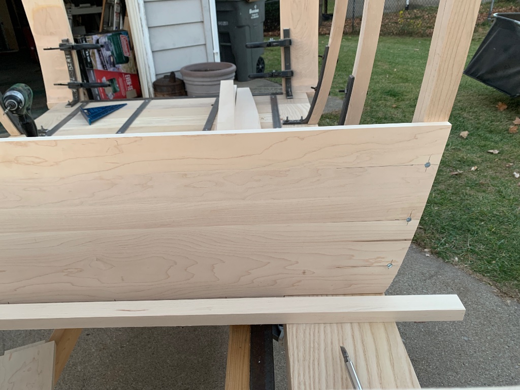 To make a 3"bend required a 3" timber to clamp the side boards to on my workbench. The filler was glued on each side and inserted in the sawcut. Then, with the board clamped to the 3" spacer, the front of the cut end with the spacer was clamped down to the bench until the glue dried. In effect, the front of the board was laminated. This eliminates any cross grain weakness in cutting curves from solid timbers. No_one has ever picked how the bends were made, but some have been intrigued when it is pointed out to them.