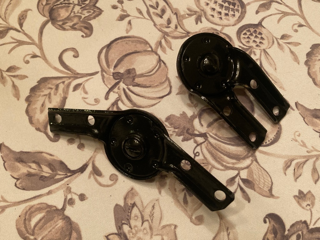 Here is a set of ‘13 (I believe) windshield hinges. My absent minded dad cleaned up and painted these hinges for his ‘15, only to find out that they do not align the windshield panels inline with one another as a ‘15 requires. I suspect these are for ‘13 as the encyclopedia shows ‘12 would have been brass, and ‘14 folds to the rear. There are a couple of stamping tears in the corners, otherwise no cracks, rust pits, damage, or noticeable wear.