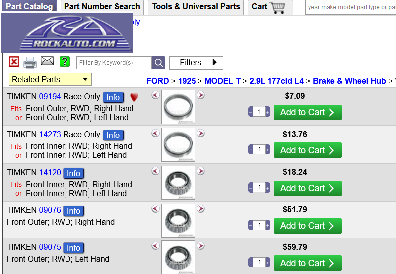 It's been so long since I've heard from Rock Auto, but if my lame brain is correct, I"m STILL waiting for the inside left bearing...or maybe it was the right side, or even both! Ha ha. Point is, they're mostly unobtanium for some stupid reason.Steve Jelf wrote: ↑Fri Nov 25, 2022 10:34 pmRock auto usually has the best prices on those, IF they're in stock.