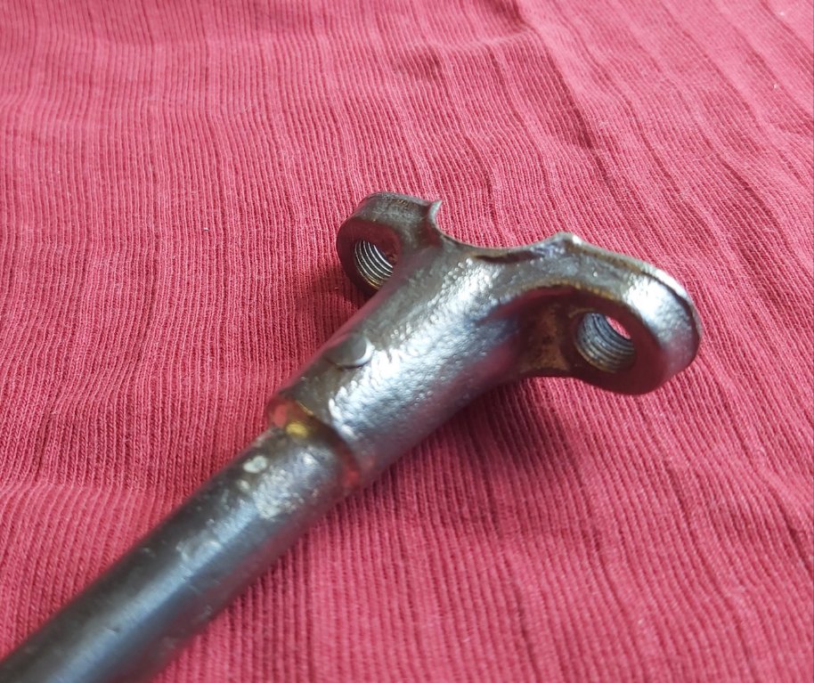 I took the link off and washed it down before heavily wire brushing it clean at the loose end. Then I washed it and air blasted it to get the oil out from between the coupling and the yoke. I once bought two lifetime supplies of silver brazing rods at a liquidaton sale of a wedding supplies company This stuff has some silver content . It was formulated to wick in in close contact work like assembling bicycle frame tubing and rhe joint pieces. It wicked in well, from both the cup end and the rod end of the yoke. Then I riveted it just to be safe.