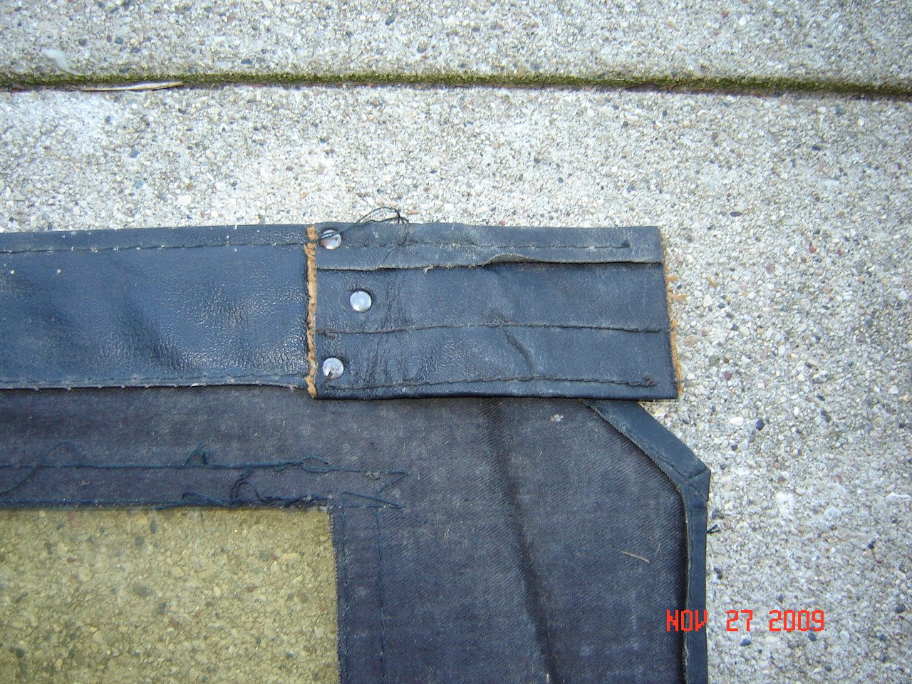 When installing those curtains, install the rears first, then the fronts. The curtain eyelets just ahead of the prop nuts go into a double common sense fastener. I appreciate Jim Rodell posting all those photos. I wish I had them to go by when I was making mine. Thanks Jim. You will notice the eyelet for the flap on the right front side curtain hasn't been punched either. That one is a difficult one to attach after getting into the car. The common sense fastener for it should have been a triple, but I don't have any of those. I took the curtain and flap, and compressed it in my bench vise so it would turn easier.