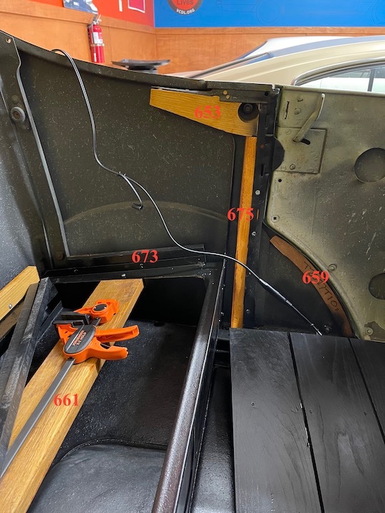 My car also did not have the 605 and 606 boards. I made them but have not installed them yet. I don't think I have the geometry correct. The metal flanges that 605 and 606 fasten hold the kick panels about 3/16" away from the body flange. If I install the kick panels, there is a gap between them and the body where I can clearly see the wood blocks. The bottoms of the flanges (see the yellow arrow below) also curves outward and makes the kick panels stick out there. I was thinking of beveling the face of 605 and 606 to let upholstery nails bend kick panels to meet the body flange. But, there would still be a gap at the bottom due to the curved flanges.