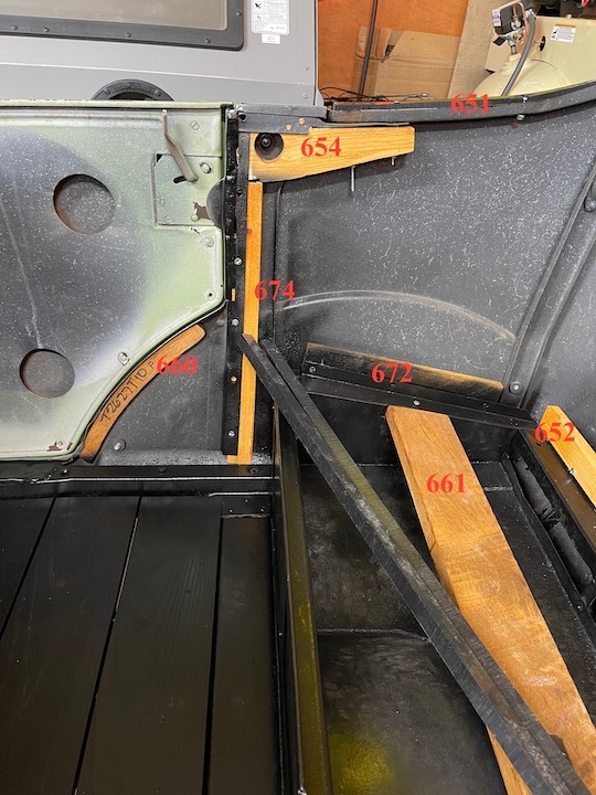 My car also did not have the 605 and 606 boards. I made them but have not installed them yet. I don't think I have the geometry correct. The metal flanges that 605 and 606 fasten hold the kick panels about 3/16" away from the body flange. If I install the kick panels, there is a gap between them and the body where I can clearly see the wood blocks. The bottoms of the flanges (see the yellow arrow below) also curves outward and makes the kick panels stick out there. I was thinking of beveling the face of 605 and 606 to let upholstery nails bend kick panels to meet the body flange. But, there would still be a gap at the bottom due to the curved flanges.