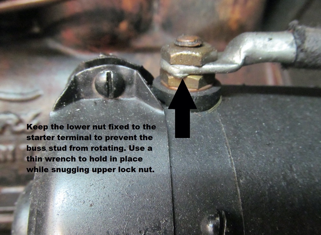 A few years ago I bought a kit from Ron Patterson which had the large copper strip. Then I went to visit Tony Bowker who has a very heavy duty soldering iron and we soldered it into place. It has worked very well ever since. To help prevent this from happening, you need to be sure the nut toward the insulator next to the starter housing is tight and that the threads are good so that when you tighten things up it will not turn the post.