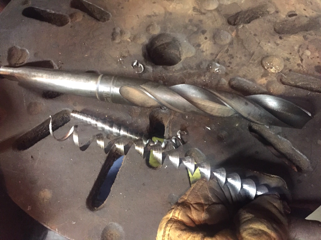 The next step was the fun part! Not everyone has capacity to drill a hole over 1 inch. But not too long ago I was at estate sale and purchased some large Morris taper drill-bits. Look how small those other holes look! I was happy to see the shavings were not getting too hot. I did drill a half inch hole as a starter. Things are looking pretty good with the bearing and shaft in place.