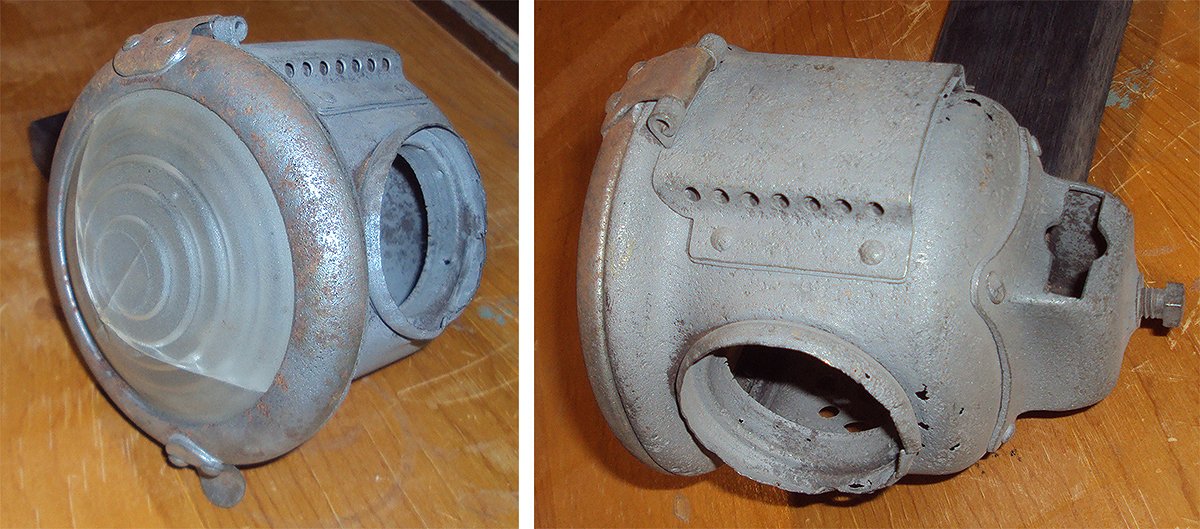 Your chimney is there, the lamp mounts with the door hinged at the top. The center hole in that star pattern of holes is where the burner goes and the ones that encircle it are air inlet holes. The burner is just like in the headlights, only smaller and the standpipe is shorter to place the flame in the center of the lamp body. Interestingly, the NOS one I had used no reflector and the interior of the lamp was just black.