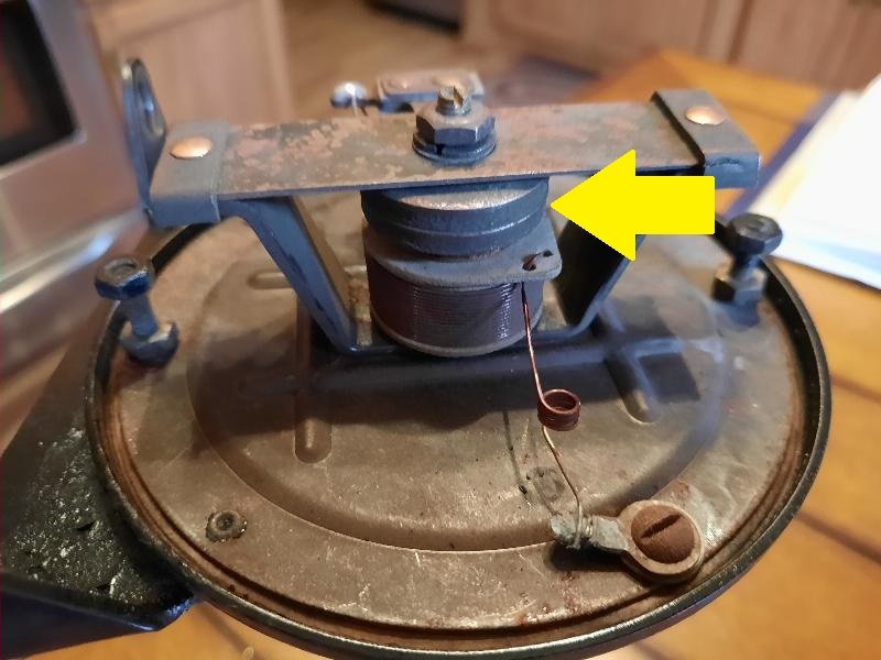 The adjuster screw & nut determines when the points will open and close. Adjusted one way too far and the magnet will pull down the disc/plunger and just hold it there, not allowing it to return. Too much the other way, and the magnet will not energize, or energize only so briefly that the discs/plunger are not drawn down with enough force to eventually strike the diaphragm. You need to adjust for somewhere in the middle, i.e., the "sweet spot". To help get close to that sweet spot, there is an initial gap setting between the contact arm and the edge of the disc, measured when the horn is at rest. That dimension was mentioned elsewhere in this thread. I'll let you find it