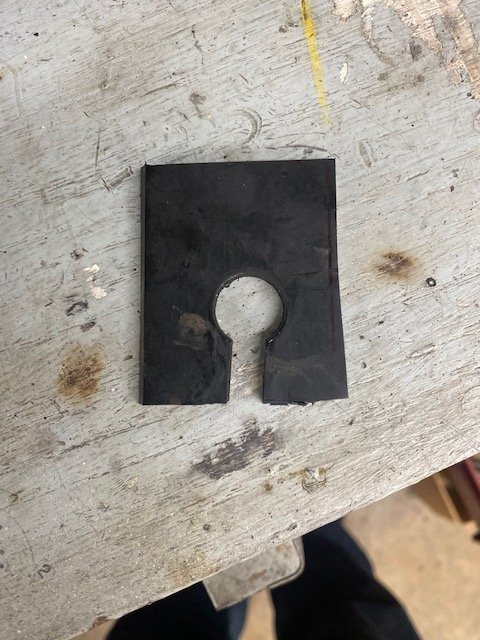 I cut this out of a piece of scrap neoprene rubber, using a gasket punch and a box cutter. It pops on the high gear shaft between the two arms, and keeps the fork more or less in the correct position. Since the rubber is flexible, it has give, and allows the fork to move into the slot with ease. After the hogshead is in place, you simply pull it out. Of the many times I have installed a hogshead, and struggled, using this simple tool, made the installation a LOT easier. I thought I would share this with everyone, it's easy to make and WORKS!