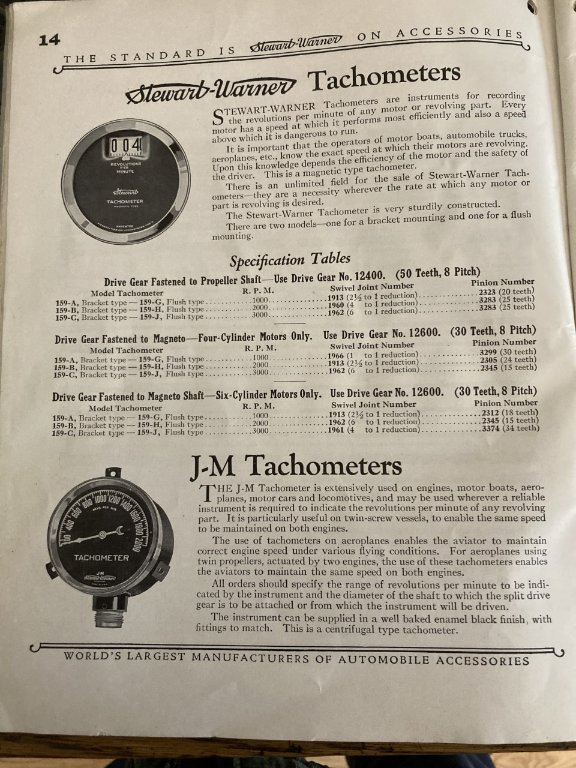 Cool Russ, nice one! I forgot I have seen that catalog at Daves’. Do you or does anyone have any pics or ever seen one of the “swivel joints? How and where would one mount it to the “propeller shaft”? The earliest tachs I have are late model A era and low rpm but no idea what the mechanical output looks like or what they were intended for. I have personally only seen V8 era and or WWII military use mechanical senders that mount on the crank snout, or distributors with built in cable drive. I bet there’s examples in early track racing cars which were scratch built. I haven’t really dug into it too much but I’d guess that tractors and other industrial engine apps would be more likely to have tachs and usually have hour meters especially if a governor is in place. Perhaps there is a more commonly made and sold part from the T era that would have been collected by equipment restorers or museums that can be adapted? -Chris