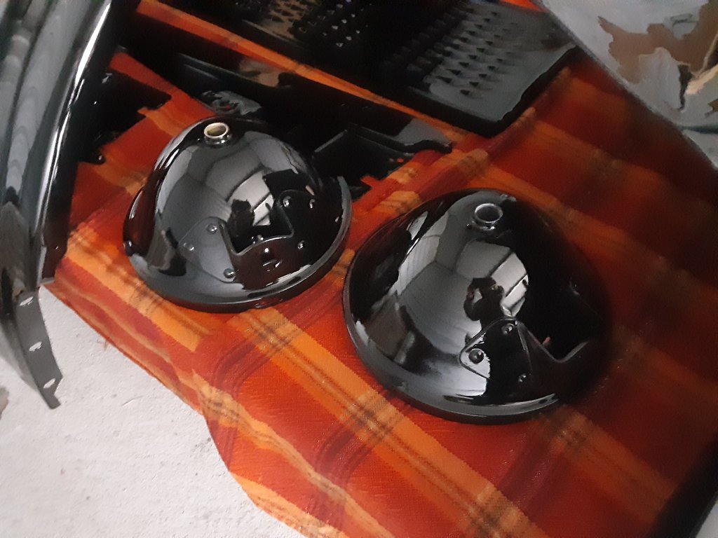Head lamps and radiator apron restoration. Back side of apron primed.
