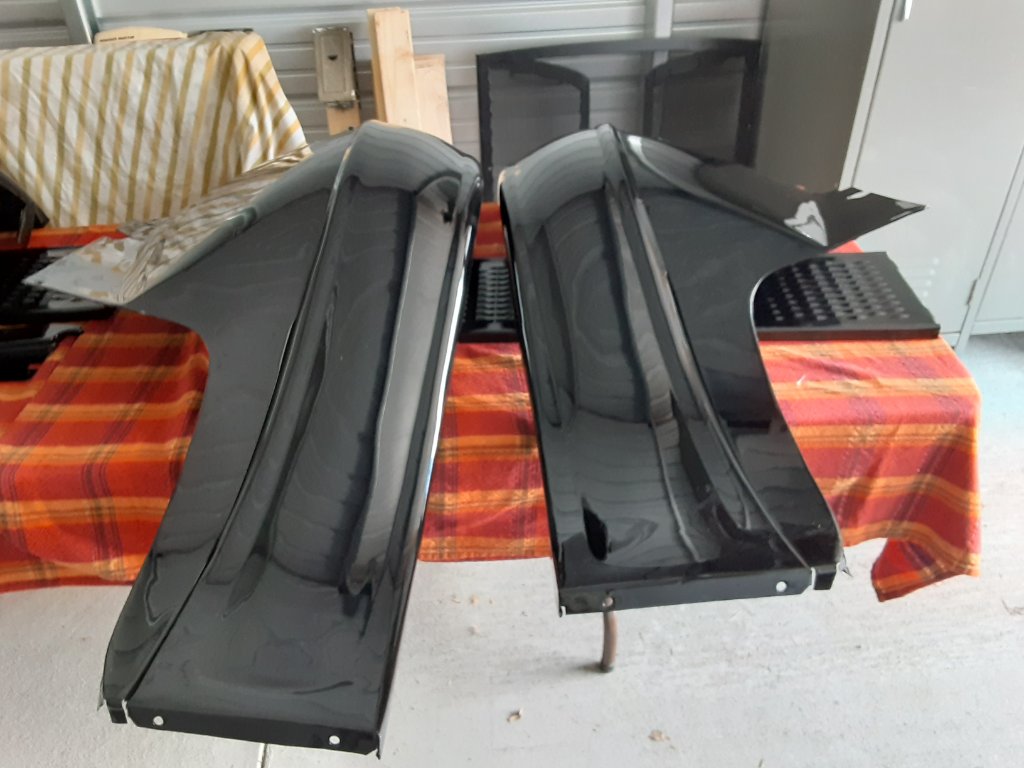 Splash panels painted and restored items in storage shed waiting for body to be painted.