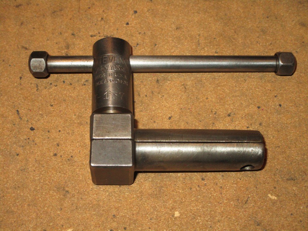 I just acquired another Stevens tool for the collection. It was on E-Bay and I did not know for sure what it was. I just knew it had the early Stevens logo and I did not have it. Someone else wanted it as I had to give more than I really wanted to. I had a suspicion what it was used for, but after it was delivered, and I could see it better than the auction photos showed, then I knew what it was for. Ill just post 3 pics of the tool to see if anyone can figure it out. Then I'll post a couple pics of it in use. I have four different Stevens catalogs and it was not listed in them. It is part no. T-137