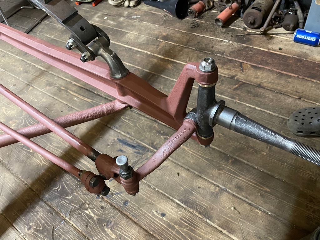 Another good day in the shop. I have almost everything in the front end restored and tightened up. It takes several pounds to rotate/swing the connected spindles by hand. I am sure this will wear in quickly with use. The before pic really doesn't do justice as to just how bad this front end was. Its starting to look like its gonna roll on its own soon! Next is the oil pan.