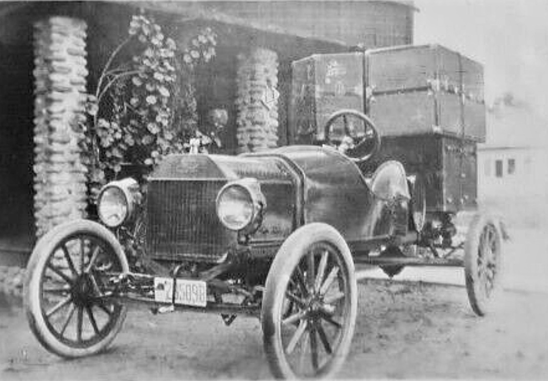 A 1910/'11 torpedo roadster with an odd gasoline tank. One must wonder what the reason is for that?