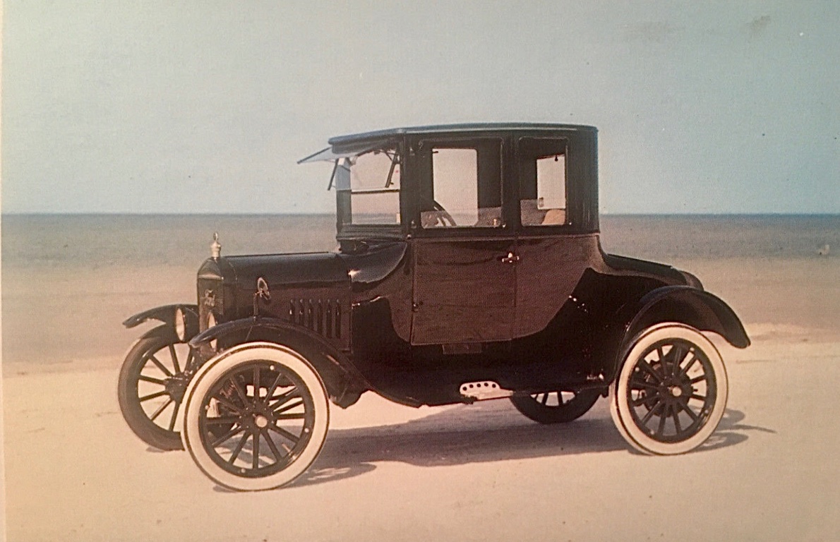 Between the radiator script, step plates, and fender mounted mirror, that coupe has three things rarely seen on Ts in the 1920s. The glass visor and the radiator cap were fairly common back in the day, and now. Those three rarities coupled with the tires means it almost has to be a modern photo.