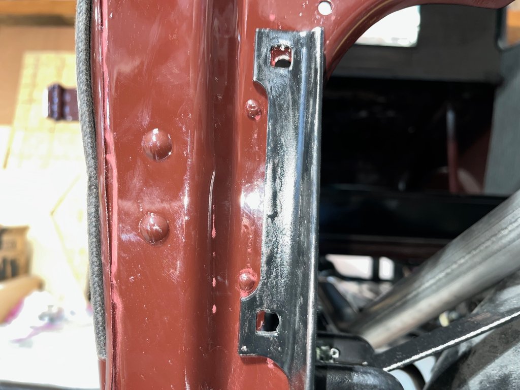 My 1915 tourer with the fitted former over the plywood firewall was trickier. It is held in position by the firewall brackets. On it, the hole in the former to take centre hood hinge rod was filled, and a new, bushed hole was created up a bit and to one side by 3/8" before the hood would fit nicely. If you know what to look for, this mod is visible, but has never been noticed.