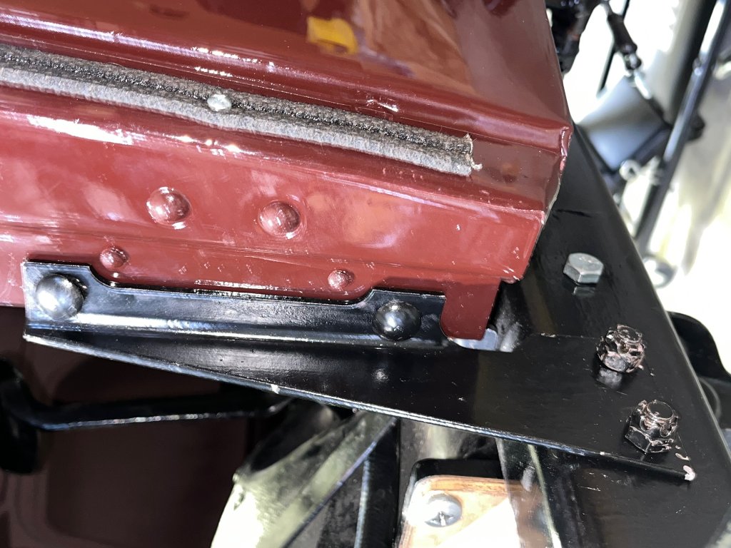 All of the eight bottom body to frame connections fit very well, including the front two (one on each side). These two do not have wood blocks, so they are metal to metal. They will separate if I raise the body.