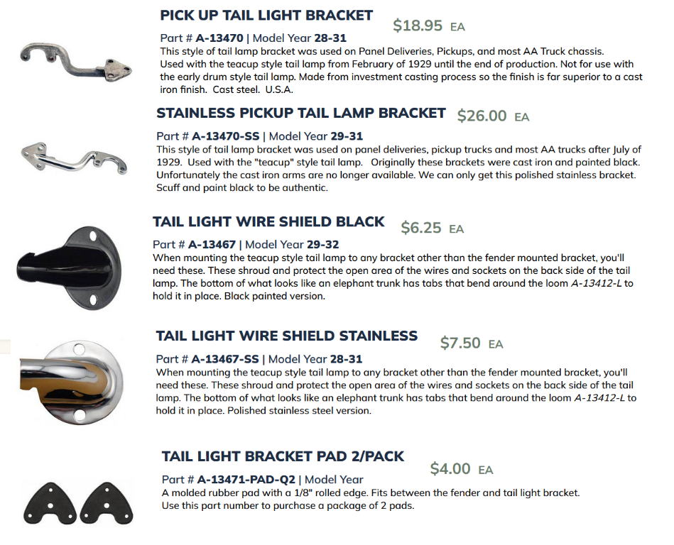 Not all suppliers have all the Model A tail light options & parts. I have listed some links to get you into their site.