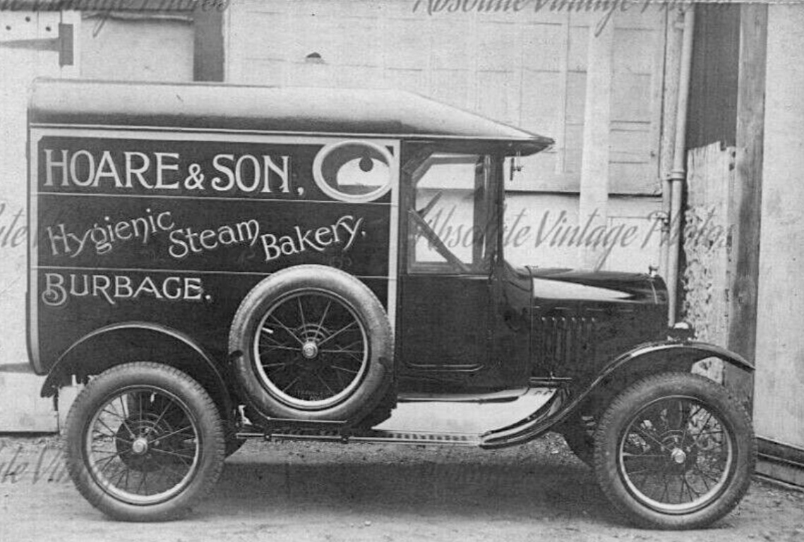 The Hoare and Sons Bakery truck is English. It is unusual to see the combination of 26-7 wire wheels on an earlier car in period photos. That style of van body is typically English. I believe some were factory built in that style. This one, with the well integrated earlier cowl may be custom built on a used chassis. It is certainly well done.