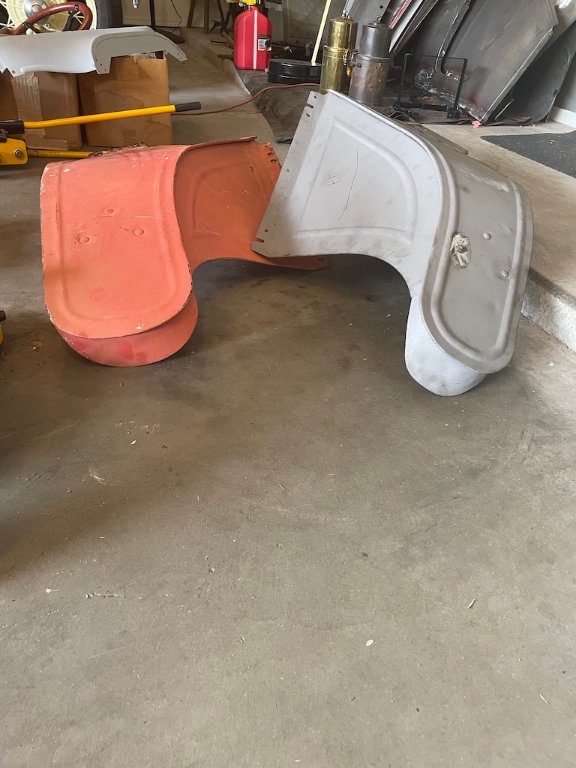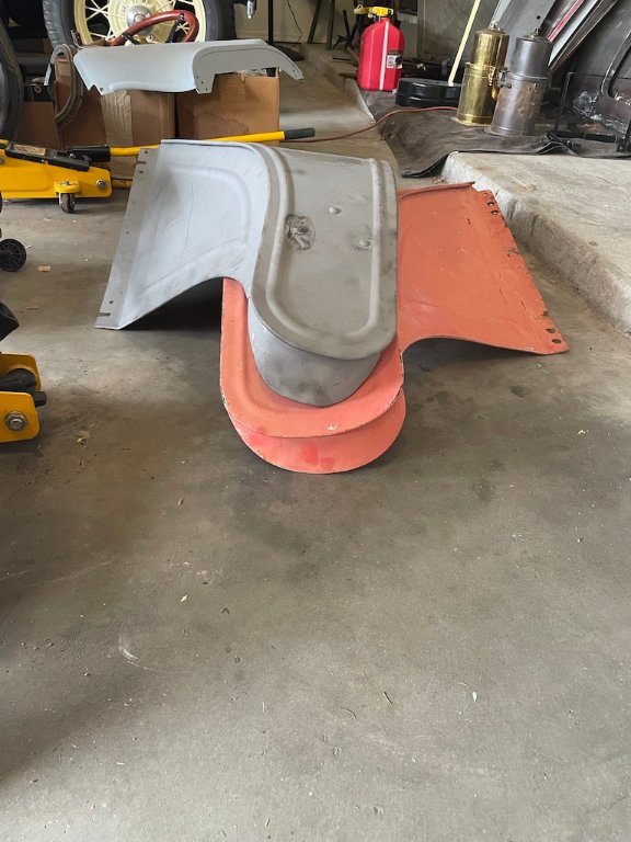 Hello, I have a 1915 runabout that needs a right front (passenger side) fender. I have what I think is a correct left fender, with three rivets, a bill, and a flat top. A friend brought me the red fender, which also has three rivets, thinking that it was what I needed. However, as you can see in two of the attached pictures, it is wider than mine and has a bill that is shaped differently. I am thinking that the red fender may be off of a speedster or a torpedo. I would be very grateful if anyone could solve the mystery.