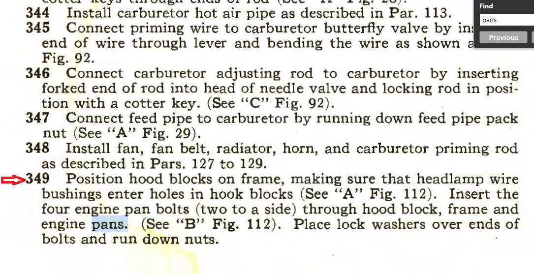 jab35 wrote: ↑Tue Feb 28, 2023 9:33 pm"The Ford service manual in paragraphs 23 and 24 refer to the pans as engine pan left and engine pan right. If there is any mention of the pans besides these I overlooked it. I didn’t find any reference to reinstalling them so I guess it was a non issue for Ford. If it was it would have been in the manual."