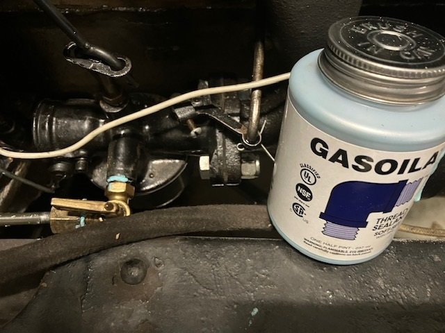 Alright! The Gasoila fixed the fuel leak problem and the Permatex fixed the up through the ground came a bubbling crude problem! Now when I go to church there isn't a puddle of gasoline under the car when I come out. You can just see a bit of Gasoila excess on the fuel line and the carburetor in the picture. Thanks to all for the suggestions.