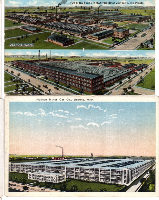 While many of the representations are artist renderings, I believe they were accurate . Count the number of stories, and number of windows, and these were huge complexes. Eventhough Maxwell production ended a long time ago, many of these buildings existed until the late 20th century. The automotive industry must have created an extonishing number of construction jobs. Not only new automobile plants, but also steel and rubber plants, road construction, etc. It truly boggles my mind.