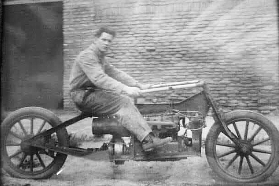The motorcycle is shaft drive. I wonder how he kept it running cool.