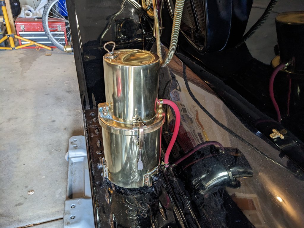 Saturday I finished up the my restoration of our 1911 touring car by reinstalling the headlight plumbing, including the correct style hose and clamps from Langs.