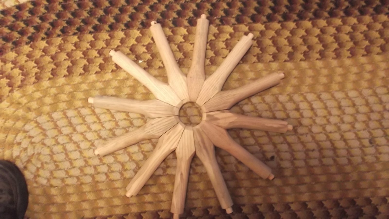 assembled one wheel to see how the first group fit; These are the 2ed group that I did tonight; In the jig to turn tenon;