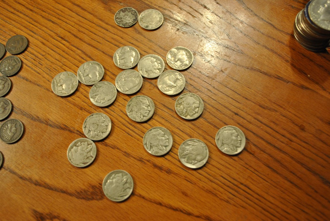 The 5 coins off to the side are Steel 1943 Pennies, couldn't find any Copper ones. A few Wheat Cents, and a whole tribe of Indian Head pennies.