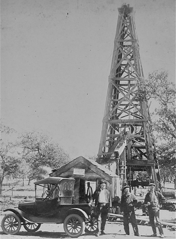 The cable tool oil rig appears to be operating. Note the blurred image of the engine flywheel inside the engine house. It looks like they have a sandline over the derrick and are running a small bailer or a sand pump to clean loose material out of the wellbore. This could be part of a drilling operation, or they could be cleaning the well bore as part of a production operation. Actual drilling would involve hanging the pitman back on the crankpin to put the walking beam into operation raising and lowering a string of tools, basically a huge chisel, in the hole. These outfits beat a hole into the earth and rock, from a few dozen feet to several thousand feet deep.