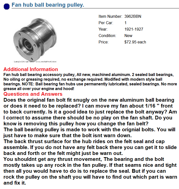John...no, the pully lines up as original...it's just that there is an additional "snoot" on the pully (about 1.5" long) which pushes the fan "out" toward the radiator. It is all hollow and the original fan bolt works with it like it was a normal "short" one. With respect to the OP, his pulley is a ball bearing new pulley and I agree that it appears a little "forward", but given their distance apart and the fact that they both have heavy lips on them (and the fact that the waterpump pulley is crowding and deforming the belt, I suspect that any minimal fan/crank misalignment will offer negligible inputs relative to the waterpump's apparent significant misalignment