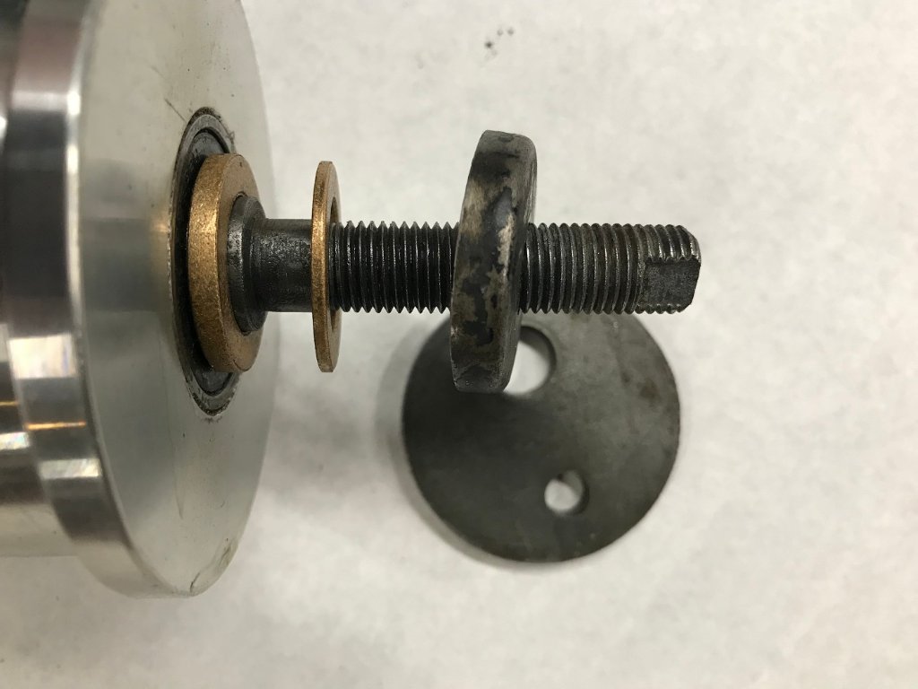 Took some pictures with a plumb-bob to show alignment. Engine is slightly off level else the plum-bob would be right on. Not sure what washers are being refereed to in the above picture of Calvin's pulley. The shinny portion is the part of the concentric setup and what looks like the cap that goes over the felt.