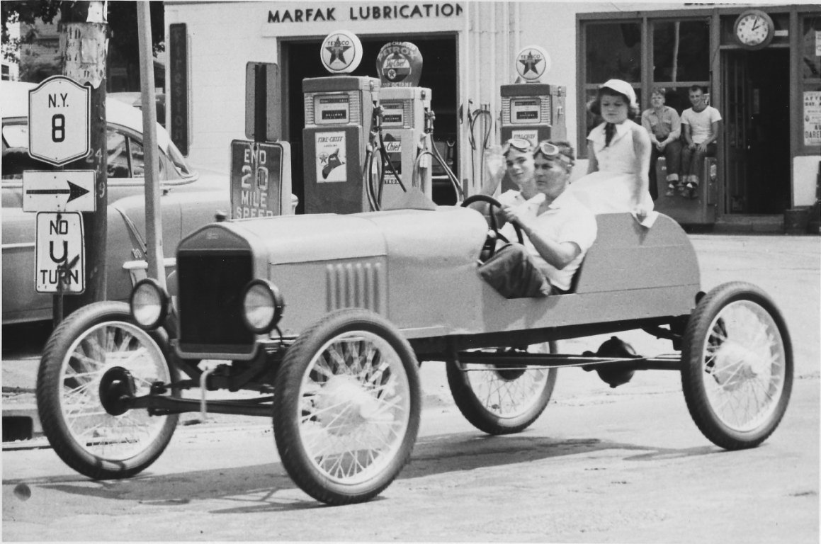 My Mom visited this past weekend and brought me some photos she found while doing some spring cleaning. These are from 1954/55 when my Dad was 15/16 years old. The T is a 1919 that was originally a Touring. It was bought used outside Philly in 1927 and my grandfather and a friend turned it into a racer. He drove it until he got married and moved to Sidney, NY in 1933 when it was put in a chicken coop for storage. In 1954, they trailered it to Sidney, NY and started to restore it. The driver in the fourth photo (in front of the Texaco station) is my grandfather, Don Barker. The driver in the first and fifth photos is my Dad, John Barker (also seen working on the engine in the second photo, and in the passenger seat in the fourth photo).