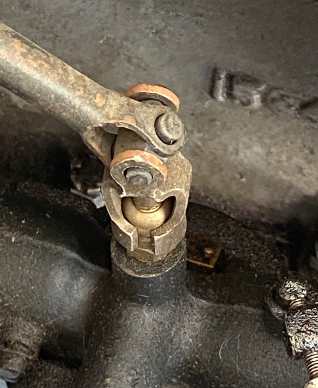 Thank you all that is very helpful. I intend on replacing the fuel line and I already bought a new one from one of the vendors. Chuck that last picture you posted that is a straight on side shot is very helpful. It appears that my choke rod is going about the same angle as yours. I’ll have to mess with bending the tabs on the u joint for smoother operation and also crimp the ears down to the brass top so it doesn’t change adjustment while driving.