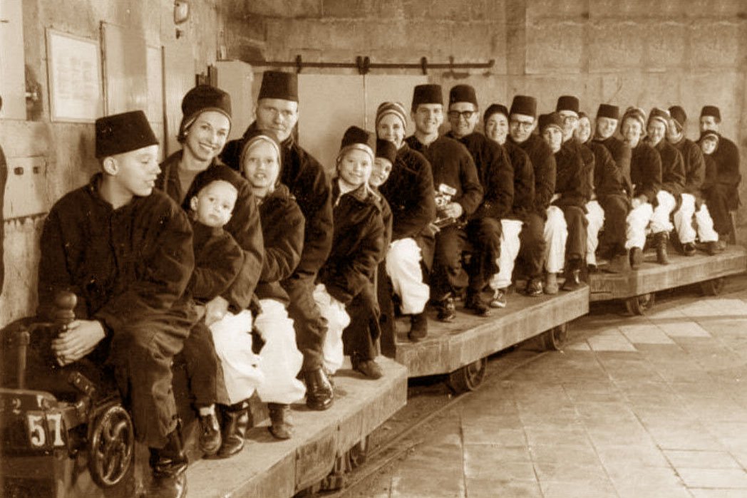 Whole happy families were employed in the alphabet mines, as this photo so aptly illustrates. Interesting to modern day observers is the employment of the fez as the miners' regulation head-gear. The reason was the low market price for "Zs". Management felt encouraging internal usage would help maintain a profitable margin on the other 25 letters. It's also the origin of the expression, ". . . cop a few Zs". Miners felt taking a cat-nap on company time was preferable to wasting time loading a mine cart with Z-bearing ore.