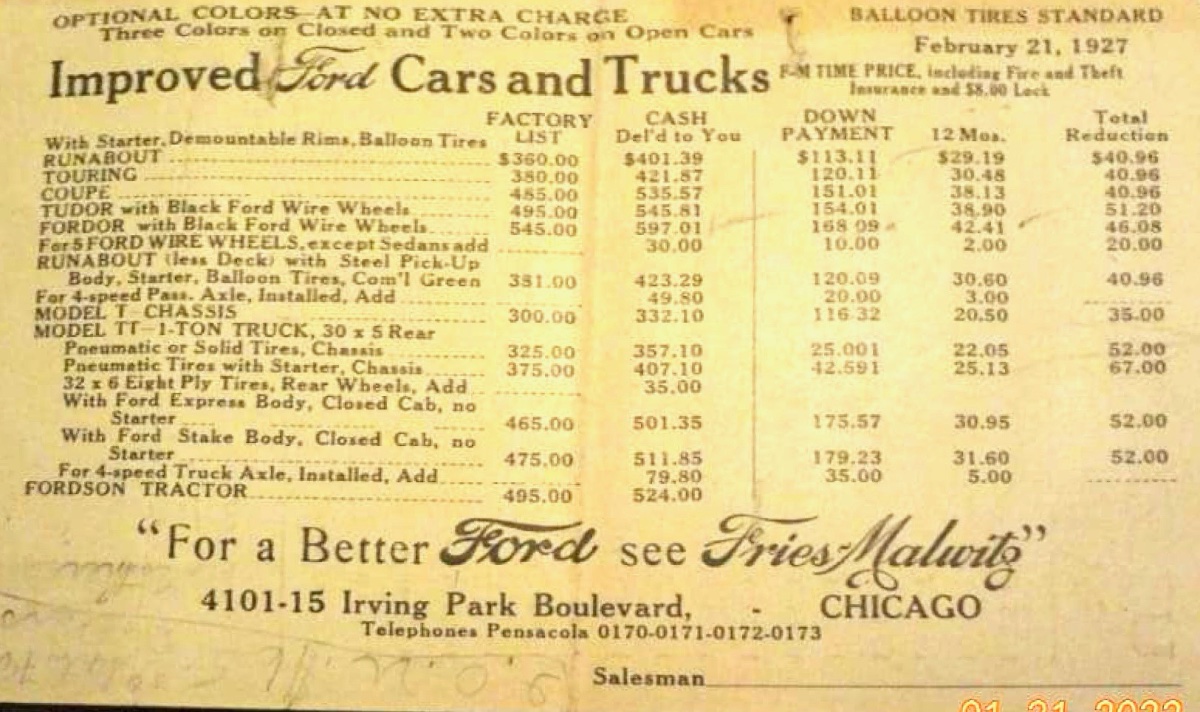 For a few bucks more the varnished wheel really set off the plain Ford. The Ford price was lower than a Chev. so why not outfit it with a few accessories, you know, always been the Ford vs Chev owners!!! Started in '26-'27!
