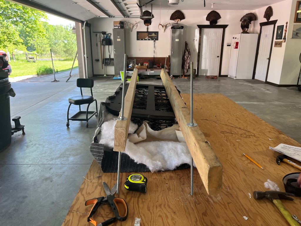 Regarding John's post, here is a home-made seat cushion compressor in action on my Flanders 20 seat. I made it from a piece of plywood, a board, and some all-thread I had lying around.