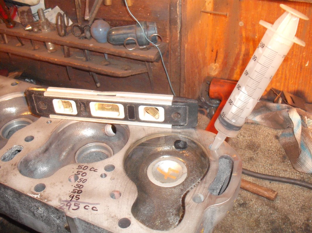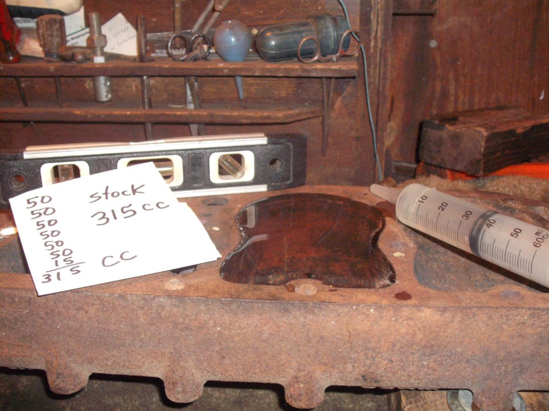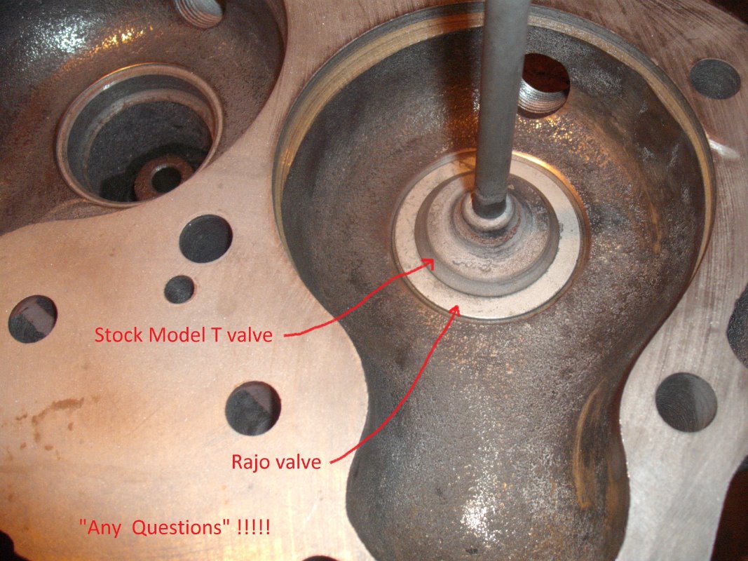 I have heard that the Rajo 4 valve heads are the same CC or compression ratio as a stock head. But to my eye it just looked to be larger. So to ease my mind I did an old school CC test. I leveled the head, put in the spark plug and filled it as full as I could get it with water from a large syringe marked in CC measurements. The Rajo measured to be 295 CCs and then the stock model T head measured to be 315 CCs. In reality I probably have an error factor of at least 20 CCs so I guess the Rajo and Stock head are the same. I also took some pics of the Rajo intake valve compared to a stock model T intake valve.... A huge difference !!! The old girl should be able to breathe very good ...