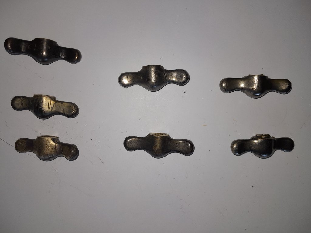 The OEM wing nuts were nickel plated brass, maybe the nickel has worn off yours. Caswell makes a home nickel plating kit that works well. :)