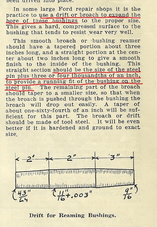 Ford Service Bulletin shows how to make a series of progressive larger tapered burnishing tools to size triple gear bushings and encouraged FORD agents to thusly treat all bushing replacements in this manner. Drawings with dimensions was supplied and FORD recommended that the burnishers be made from an old axle or a good tool steel.